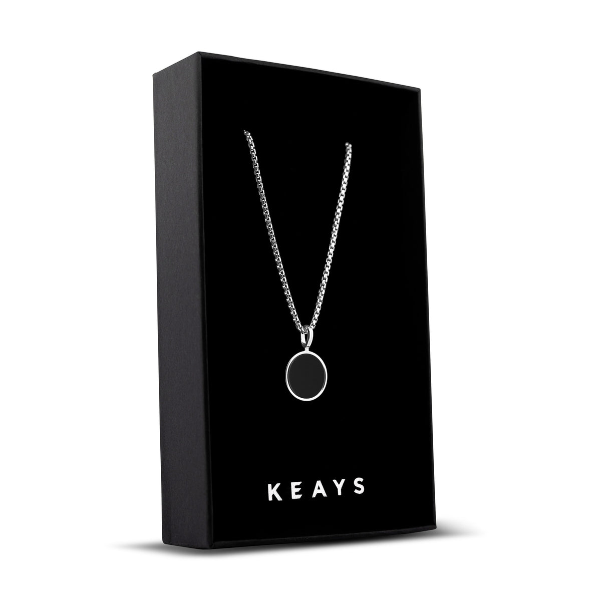 The Keays Onyx Medallion Silver Pendant holds a hand-cut black onyx stone in a beveled round frame of polished gold. At 15 mm, it brings sharp contrast in a compact design—made to pair with our 1.8 mm Round Box Silver Chain.
