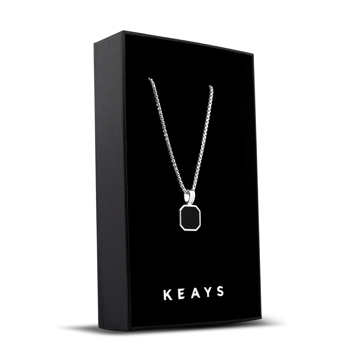 The Keays Onyx Octagon Silver Pendant holds a hand-cut black onyx stone in a beveled silver frame. At 15 mm, it delivers strong contrast in a compact design—best paired with our 1.8 mm Round Box Silver Chain.