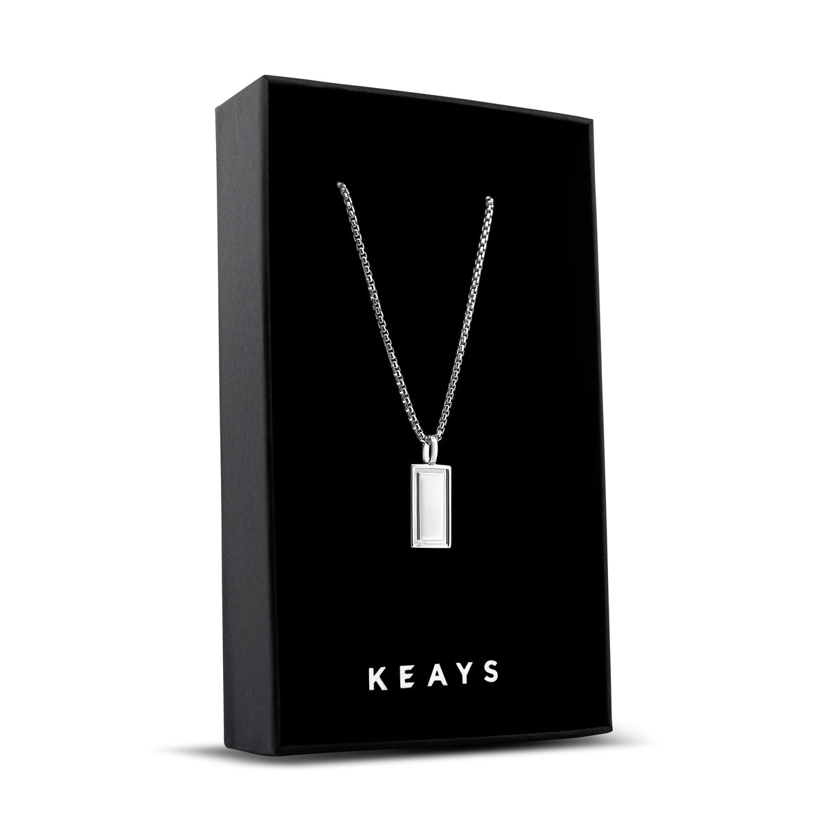 The Keays Pillar Silver Pendant is a straight bar of polished silver with a subtle step cut. Its clean lines and sharp reflections give it a strong, controlled look—best paired with our 1.8 mm Round Box Silver Chain.